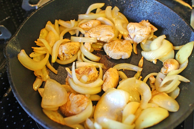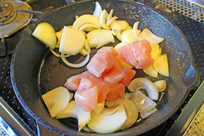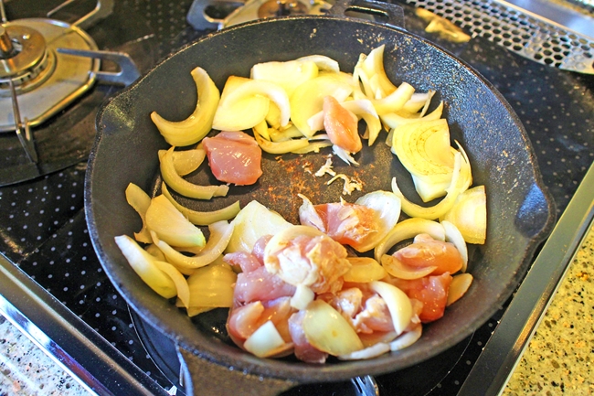 玉ねぎ刻んで、鶏肉と一緒に炒めます