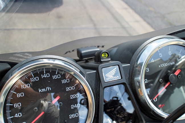 ハンドルに取り付けたら、カウルがあって見にくかったので左ミラーの根元に取り付けました