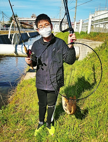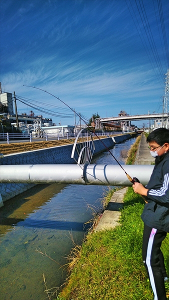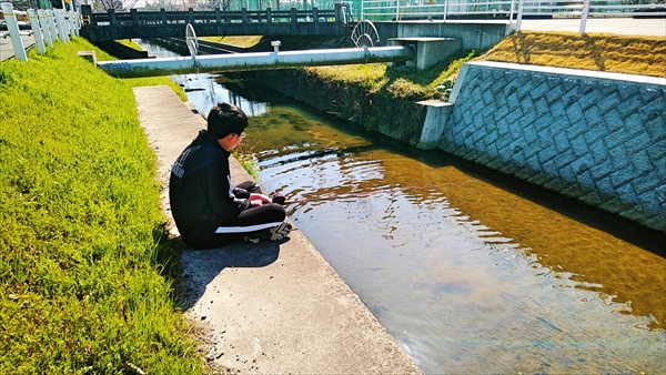 次男を連れて、近所のどぶ川へ魚釣りに行く