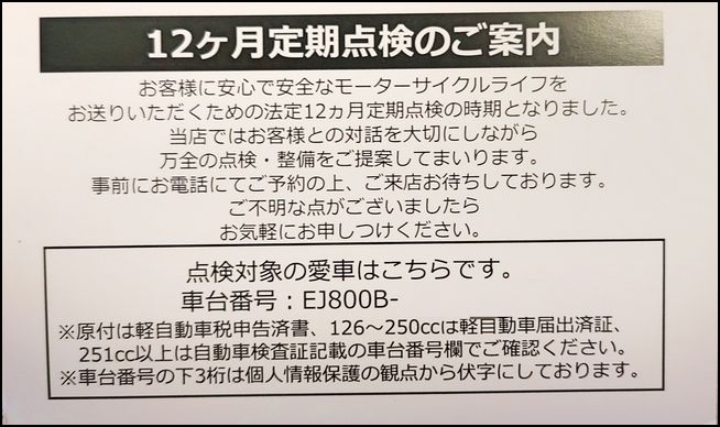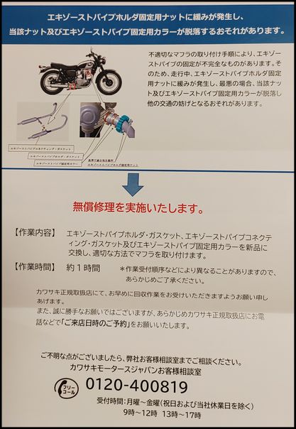 たぶんこの点検を受けないと、カワサキからの保証はありませんよと言われると思う