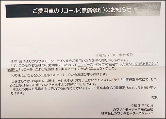【あなたの乗っているW800がリコール対象ですよ】って手紙
