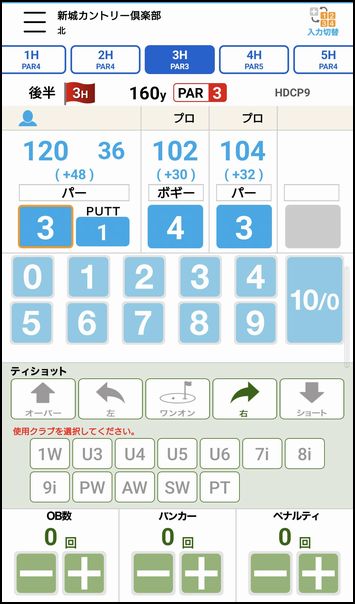 こんな画面に、ホールごとにスコアとパット数、同伴者の打数を入力