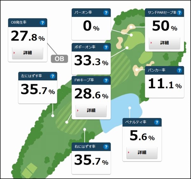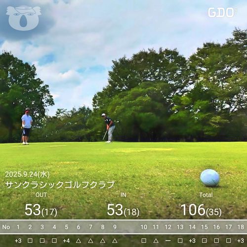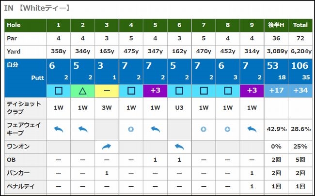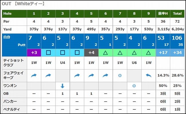 前半戦、OBを3つも出した割に、後半が落ち着いて53打