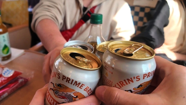 指定された3号車に座って、さっそく乾杯