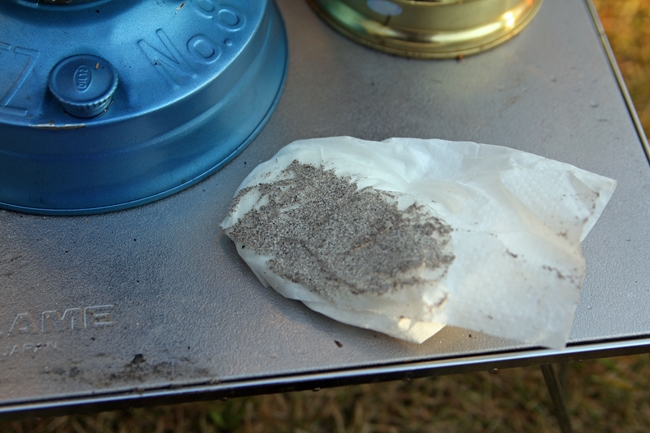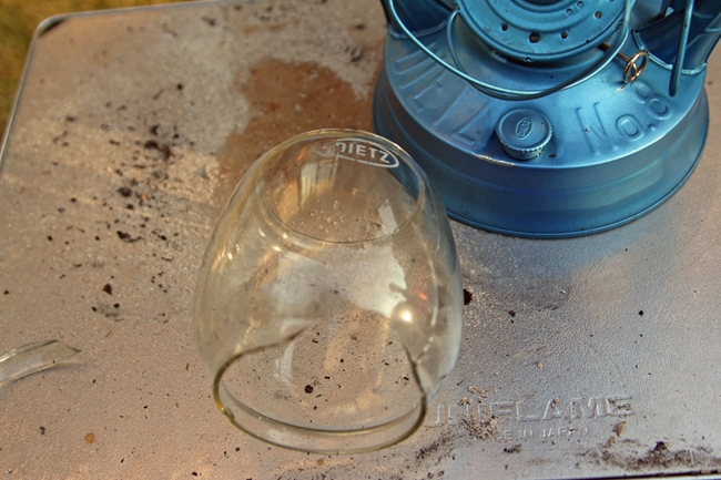 前の晩に焚き火をして残った灰と、すっかり火屋も冷めたランタンが目の前にある