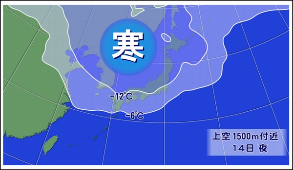 あす15日にかけて、北日本や北陸地方の上空にはさらに強い寒気が流れ込み、西日本の上空にも強い寒気が流れ込むため、冬型の気圧配置はさらに強まる見込みです